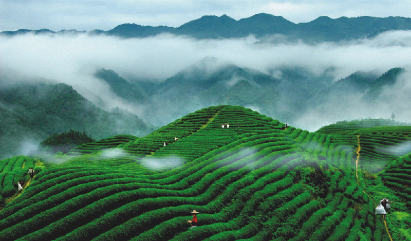 在碣灘山的山坡上,坐落著3000余畝蓊郁青翠的碣灘茶園,茶園綠染碣灘兩岸,有“栽培布局奪天工,碧毯陳鋪十五峰,唯有碣灘茶最好,知音海外話田中”之贊語。碣灘茶香遍全球,歷史久遠(yuǎn),在唐代已成為貢茶,歷久不衰。`1972年,當(dāng)時(shí)的日本首相田中角榮來華訪問,曾向周恩來總理夸贊碣灘茶,并稱之為“中日友好之茶”。